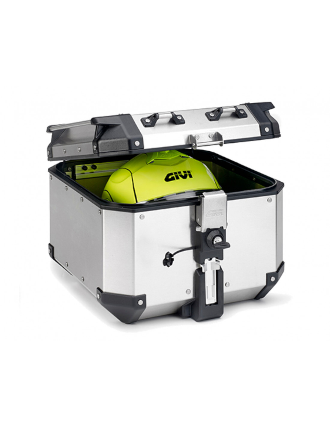 Su estructura cuadrada, realizada totalmente en aluminio con acabado natural, recupera el diseño «Adventure» típico de las maletas laterales OUTBACK. Los perfiles y los parachoques angulares a contraste de tecno polímero negro añaden el toque final de estilo.