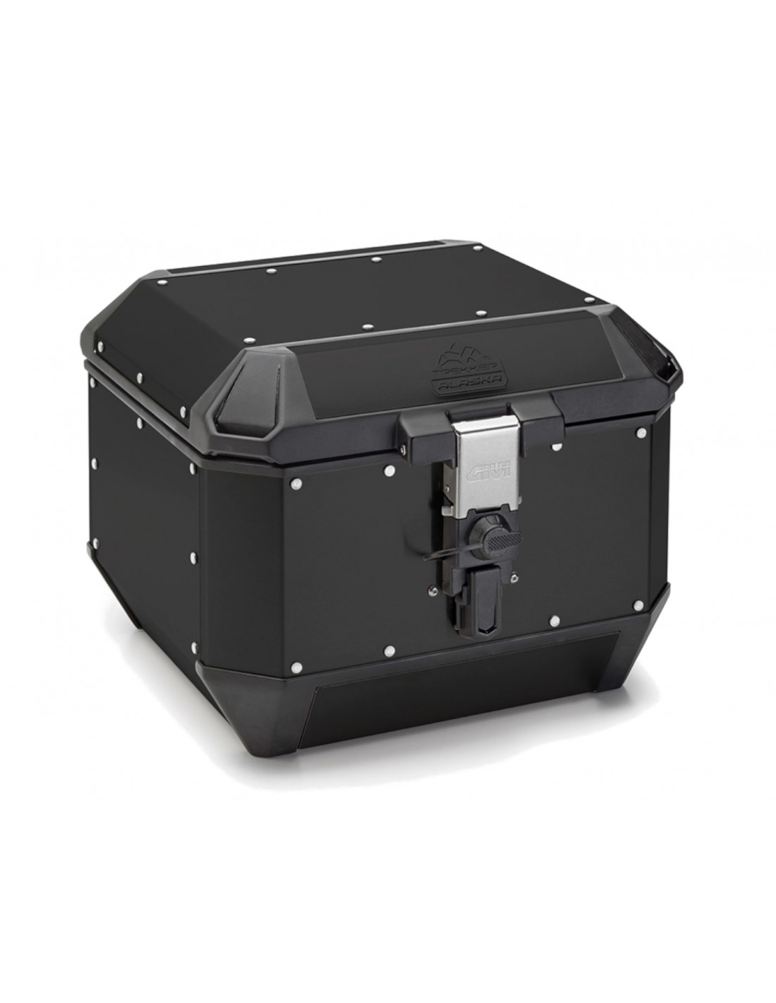 La maleta posterior de moto Trekker Alaska de aluminio natural, 44 L.. Puede albergar un casco modular. Dotada del sistema de fijación MONOKEY®, que permite utilizar la misma llave para la cerradura, la apertura y el desenganche de la parrilla. Compatible con todas las parrillas Monokey, excepto las que están dotadas de contacto para el kit de luz de stop.