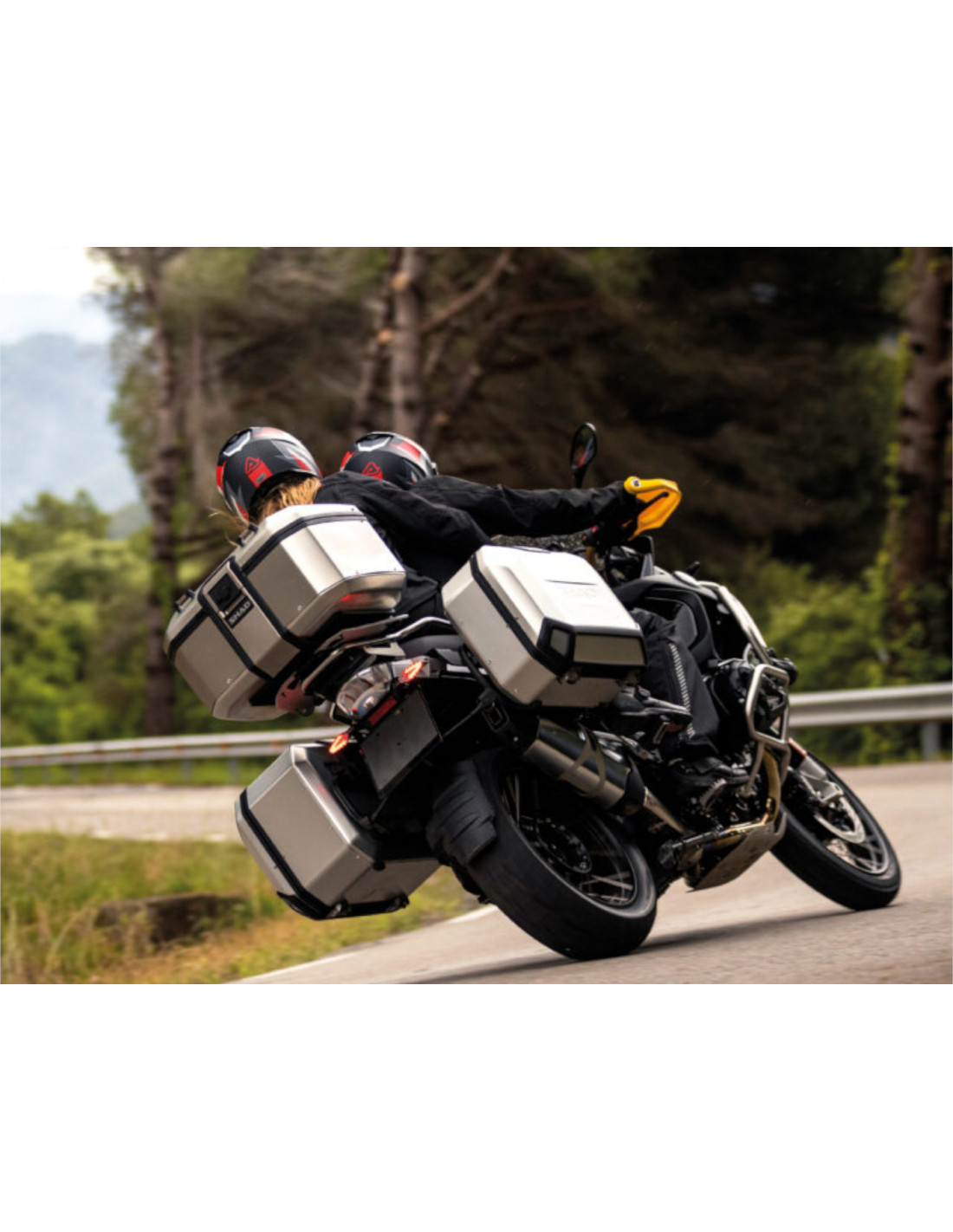 El baúl TR48 está diseñado, desarrollado y fabricado 100% en Barcelona con capacidad para un casco (Trail) o 2 cascos (modular y jet). Fabricado en aleación de aluminio endurecido, un tipo de aluminio más fuerte y ligero que permite una sección transversal reducida de 1,2mm para obtener un peso mínimo con la máxima resistencia. Incluye el sistema patentado (pendiente) «TERRA Lock System».